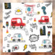 A playful, cartoon-style city pattern featuring buses, cars, helicopters, traffic lights, buildings, and fun doodle text like “Beep Beep,” “Wuz Up?” and “Go,” in bright red, yellow, blue, and black tones.