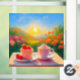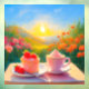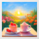 Esta pintura representa una tarde tranquila y relajada llena de dulces momentos de postre 🍓 🍰 ☕. A lo lejos, un cielo azul claro, un sol brillante y montañas de colores suaves. Las flores rojas y rosadas están en flor, lo que permite sentir la belleza de la naturaleza. En la mesa de madera, un pastel de fresa y una lata de fresa con crema suave de color rosa crean una escena perfecta, haciendo el momento aún más especial. La escena parece estar mostrando el momento más dulce y relajante del día. Todo se mezcla en paz y comodidad, y cada vez que veas este cuadro, sentirás felicidad y tranquilidad. Los colores cálidos y luminosos de la pintura alegran el ambiente del espectador, haciéndolo aún mejor. A través de esta obra de arte, espero que muchas personas puedan tomarse un descanso de sus vidas ocupadas, encontrar un momento de relajación y experimentar un tiempo de curación. Es mi deseo que se le añada un poco de felicidad y paz a tu vida. 🙏 ❤️