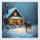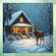 Hermoso ciervo de 12 puntas en una tranquila noche nevada parado frente a una cabaña de troncos con pequeñas luces centelleantes en los árboles y un porche iluminado acogedor.
