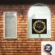 Una corona dorada de puntos y estrellas y las palabras - Te Deseamos una Feliz Navidad y un Feliz Año Nuevo aparecen en esta ventana. Elija CUALQUIER TAMAÑO y **cierre delantero o posterior. (El tamaño mostrado es de 24" x 24", pero puede ser mayor o menor.)