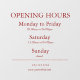 Haga que sus horas de negocio sean claras y elegantes con esta Calcomanía para Ventana personalizable. Perfecta para puertas y ventanas de tiendas, esta calcomanía reutilizable muestra sus horas de apertura con un diseño limpio y profesional que llama la atención. Fácil de aplicar y quitar sin residuos, ideal para tiendas, cafeterías, salones y oficinas.