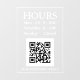 Letrero de Horas Abiertas con código QR para la entrada de la tienda o ventana en texto blanco sobre fondo transparente con mensaje de código QR.