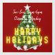 Letrero adhesivo de ventana festivo para tiendas, restaurantes u otros negocios, con un árbol de Navidad decorado y texto de neón que dice "Felices Fiestas". El texto adicional en blanco es personalizable y puede incluir el horario de atención o información relacionada.