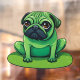 Pug verde lindo que se parece a una rana sentada en un lililipad. Se puede cambiar el color de fondo.