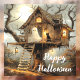 Invitados de medianoche en la ventana de Halloween del Árbol de los Farolillos Encaramado sobre un árbol viejo enredado, una casa de árboles rústica resplandece con una cálida luz de farolillos, arrojando parpadeantes a través de las hojas de otoño. Una figura fantasmal se sienta tranquilamente en el porche, al lado de un atento gato negro, ambos bañados por la luz de la luna mientras los murciélagos se agitan sobre sus cabezas. Las ramas desnudas se extienden al cielo nocturno, en silueta contra la mirada plateada de la luna llena. Whimsical y espeluznante, la escena humilla con magia silenciosa —donde los visitantes espectrales y los compañeros felinos comparten secretos bajo las estrellas.