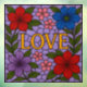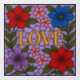 This cling displays a square stained‑glass artwork with the word LOVE in the center in elegant metallic gold lettering. The gold has a soft reflective sheen, giving it a polished, professional look that stands out against the lavender background. The background is composed of mosaic‑style stained‑glass pieces in shades of lavender and soft violet. Each piece is outlined with black lead lines, creating a classic stained‑glass structure while keeping the look smooth and harmonious. Around the central word is a symmetrical arrangement of normal flowers. There are red flowers with layered petals and subtle shading, blue with soft gradients and natural petal veining, purple and lavender blossoms that blend with the background and small pink accent flowers adding softness and balance.