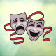 Ilustracion vectorial de máscaras teatrales de comedia y tragedia con una cinta roja. Etiquetas: actuación, actor, cine, comedia, drama, película, fruncido, dolor, felicidad, humor, reír, máscara, películas, actuación, triste, teatro, tragedia, sonrisa, teatro