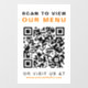 Moderna ventana de personalizable que cierra el signo para su restaurante o cafetería con un código QR para que los clientes puedan escanear su menú sin contacto. "Escanear para ver nuestro menú" está en negrita en tipografía negra y naranja (contáctenos si desea cambiar los colores). Agregue líneas de texto adicionales como su sitio web.