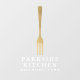 Un motivo de diseño de moda y lujo de un tenedor de oro falso llama la atención sobre el texto falso dorado para su nombre de negocio en esta tarjeta personalizada de ventana. Creado para empresas de restauración, restaurantes, cafés y más. Arte y diseño © 1201AM Design Studio