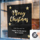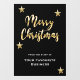 Feliz Navidad en una escritura elegante moderna en dorado metálico. Decorado con estrellas doradas metálicas.