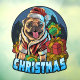 Ilustracion gráfico de un pug de Navidades con regalos en el bosque nocturno.