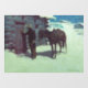 Ventana con la pintura al óleo de Frederic Remington, The Belated Traveler (1906). Un vaquero golpea la puerta de una cabaña en medio de una nieve de invierno. Él sujeta las riendas a un caballo marrón a su lado. Un regalo perfecto para los amantes del caballo y el viejo oeste.