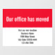 Esta calcomanía de ventana roja y blanca dice 'Nuestro oficina se ha mudado'. Utilice el campo blanco para personalizar su calcomanía de ventana con el nombre de su empresa, nueva dirección y número de teléfono.