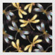 Patrón sin foco con oro, joyas, libélulas brillantes con las detalladas alas brillantes sobre fondo negro. Dragonfly de oro.