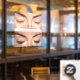 Pegatina para ventana de salón de belleza con extensiones de pestañas personalizadas y rizado de pestañas.