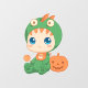 Bebé adorable vestido con un traje de dragón verde con pinchos naranjas y una bestia naranja con cráneo. Una calabaza curvada está un poco atrás.