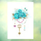 Llave de oro antiguo con rosas turquesa de moda decorados con hojas de oro blanco y cuentas rosas y azules. Color de moda. Rosas turquesas. Oro blanco. Tifanía azul.