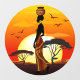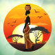 Hermosa silueta africana vestida con vestimenta de tela tradicional de cera de cera, con un frasco decorado a mano, Caminando en la asombrosa naturaleza de la sabana africana, en un cálido y pacífico atardecer. Ilustracion vectorial original Copyright BluedarkArt TheChameleonArt.