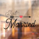 Solo casada... atadura de ventana. Elegante tipo de letra de guión con un ilustracion de flecha de corazón rojo. Grabado negro sencillo y dulce. ¡Pida uno por la ventana trasera de tu auto y deja que el mundo sepa que acabas de casarte!
