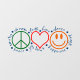 Paz, Unidad, Sueño, Fe, Esperanza, Baile, Risa, Felicidad, Amor, Alegría. Con los símbolos de la paz, un corazón y una cara. En verde, rojo, naranja y azul.