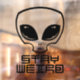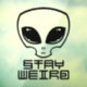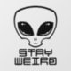ilustracion de cabeza alienígena personalizado con grandes ojos oscuros con letras de "Stay Weird". Palabras clave: alienígena, espacial, marciana, personalizado, humor, vector, ciencia ficción, estancia, raro, espacio