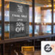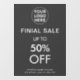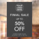 Anuncie su venta final con nuestro adhesivo de ventana de tienda de logotipo gris, que incluye ofertas de descuento especiales. Este adhesivo llamativo y personalizable llama la atención, lo que garantiza que su mensaje promocional sea claro y atractivo para los clientes.