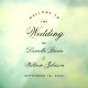 Todo el texto es negro. La palabra Boda y los nombres están escritos en una elegante letra caligráfica, el resto en mayúsculas. Las palabras "Bienvenidos a" están curvadas como texto en arco sobre todo.