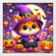 Esta adorable imagen muestra a un zorro personalizado vestido para Halloween. El zorro está usando un gorra mago morado con una hebilla de oro y una capa púrpura a juego sobre un traje negro con corbata de arco. Está sosteniendo un bastón de caramelo en una mano y un balde de calabaza en la otra, listo para el truco o el tratamiento. El fondo es una vibrante escena nocturna con luna llena, murciélagos, estrellas, calabazas y decoración festiva. Los ojos grandes y expresivos del zorro y su bonita sonrisa hacen imposible no amar.