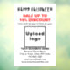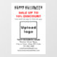 Terror, espantoso, espeluznante, siniestro, fantasma, monstruo, calavera, calabaza y demás. ¡Feliz Halloween! Un día festivo para asustar, pero no para asustar a los clientes. Un día para celebrar en octubre y también para promocionar tu negocio. Pegatina de ventana personalizable con Oferta de Halloween, el nombre de tu negocio y otra información. Pegatina de ventana que puedes utilizar como material de marketing para atraer a más clientes. Personalízala y muéstrala para convencer a más clientes de que compren tus productos o les gusten tus servicios. Los colores del diseño son textos en negro y rojo sobre fondo blanco. Los contenidos son un saludo de Feliz Halloween, textos de oferta con porcentaje de descuento que ofrecerás, fechas de la oferta, nombre de tu negocio, logotipo, dirección, número de teléfono, correo electrónico y sitio web o página de redes sociales de tu negocio. Por favor, comprueba la apariencia después de subir el logotipo y escribir los textos. Si la apariencia es de tu agrado, puedes hacer tu pedido ahora. Si necesitas cambiar el tamaño y mover el logotipo y los textos para que se ajusten a esta pegatina de ventana o al tamaño y forma que elijas, por favor, cambia en la herramienta de diseño. También puedes cambiar el color de fondo, el color