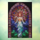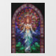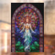 Ventanilla de vidrio con manchas iluminada que inspira la luz del día. Esta impresionante imagen muestra una magnífica vidriera retroiluminada, bañada por una luz del sol suave y cálida. Los patrones intrincados y los colores vibrantes crean una imagen fascinante de luz y sombra que evoca un sentimiento de asombro y asombro. El diseño de la ventana se caracteriza por una cautivadora mezcla de formas geométricas, motivos florales y símbolos religiosos, todo realizado meticulosamente con un detalle impresionante.