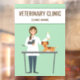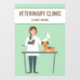 Diseño para veterinarios y clínicas veterinarias con ilustracion personalizado de Destei de una veterinaria femenina con algunos animales. La mujer lleva puesto un abrigo blanco de laboratorio mientras sostiene un gato gris y un ave de loro tipo gallo. También hay un lindo perro marrón sobre una mesa. El color de fondo es verde claro. Personalice las áreas de texto de ejemplo con su nombre comercial / otro texto personalizado.