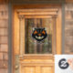 This vintage style Halloween window cling features an illustration of a black cat's face in black, orange and cream with a customizable message below.