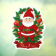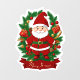 Farbenfroher Sticker im Cartoon-Stil. Roter Weihnachtsmann, umrahmt von Tannenzweigen, die mit Geschenken und Deko bestückt sind.
