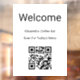 Welcome your customers with this black and white sign. There's a display image at the bottom. You can enter your website URL to create your own QR code to send your customers to today's menu or a price list. The display text can be edited to show your desired text. (Shown: Welcome Elizabeth's Coffee Bar Scan for Today's Menu.) The sign is white. The text is black.
