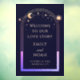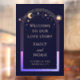 Welcome To Our Love Story Navy Blue Celestial Welcome Sign Celestial Cosmic Galaxy Space Wedding Welcome Sign Window Cling features a rainbow sun, moon and stars frame on a dark navy blue background. Inside the frame features the text "Welcome to our love story" with your names, wedding date and location in elegant peach calligraphy script. Designed for you by ©2024 Evco Studio www.zazzle.com/store/evcostudio
