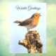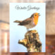 Winter Greetings text you can customize. Robin singing, on a small tree stump.