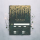 Un caprichoso ilustracion de exuberantes viñas colgadas de oro (¡efecto digital, no Relieve metalizado real!) sobre un brillante fondo de color verde esmeralda, brillantes con luces de hadas y mágico polvo, decora esta tarjeta RSVP de bodas de otoño de invierno con una temática forestal encantada. Una carta de respuesta elegante y moderna para un boda de cuento de hadas. Perfecto para novias que adoren el entorno de un cuento de hadas, el bosque de hadas o el tema del hadas y verde esmeralda, malva y oro.