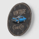 Esta es una representación de un auto clásico azul americano con gráficos de estilo vintage en el fondo para un aspecto retro.