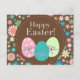 Perfecto para Pascua con el logotipo del huevo de Pascua Feliz y con un bonito diseño floral retro de flores de margarita multicolor de amarillo y azul y blanco contra un fondo marrón chocolate. Este ilustracion floral es luminoso y está de moda.