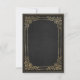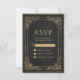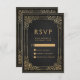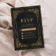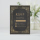 Esta elegante tarjeta RSVP de boda presenta un marco dorado vintage ornamentado en un fondo afligido fuera de negro, en imitación de una cubierta de libro antiguo. El diseño del marco se repite en la parte posterior de la tarjeta.