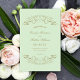 Los torbellinos y las flores decorativas enmarcan este elegante diseño de la ceremonia boda de inspiración vintage. Fondo verde pistacho pastel con diseño de oro antiguo. Personaliza el texto del personalizado para tu fiesta nupcial, información de la ceremonia y mensaje de agradecimiento. Nota: estos programas de peso de texto llegan planos y requieren plegado para ensamblar.