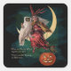 Diseño de postales de Halloween vintage. El diseño tiene una vintage bruja y búho de Halloween sentados en la luna. La bruja sostiene un Halloween Jack O Lantern. El verso de Halloween dice "Cuando el búho y la bruja juntos son vistos, hay travesuras preparándose en Halloween".