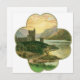 Imagen de la fiesta de los saludos del ilustracion Vintage Saint Patrick's Day. Un paisaje irlandés con un castillo al lado de un río al atardecer dentro de un gran shamrock dorado y afortunado. ¡Cuatro tréboles de hojas representan buena suerte!