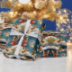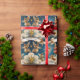 Este papel de envoltura presenta un diseño navideño vintage con ángeles crúbicos volando entre nubes y estrellas doradas. Los ángeles están vestidos con batas pastel, con delicadas alas y coronas de flores en la cabeza. El fondo es un cielo nocturno profundo y estrellado, con brillantes vigas de luz de algunos ángeles. Grandes estrellas de brújula dorada acentúan la escena, añadiendo un toque celeste. En la parte superior e inferior, los carteles con la frase "Alegría al mundo" enmarcan elegantemente el diseño. La estética general es nostálgica y paradisíaca, evocando un sentimiento de paz y alegría.