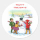Estos pegatinas presentan una imagen vintage de niños construyendo un muñeco de nieve y las palabras: Felices Fiestas. Introduzca un nuevo mensaje en la plantilla para cambiar el texto. Disponible en dos tamaños diferentes.