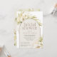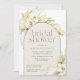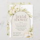 Las invitaciones a la ducha de moda tropical con nubes en una atractiva paleta de color neutro cuentan con un elemento central arqueado que lleva los detalles de la ducha de novia, acentuado con frondas de palma de color verde claro, follaje de la isla boho, orquídeas blancas, botánicos secos y pampas de playa.