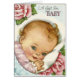 Un ilustracion del vintage de una tarjeta de regalo del bebé ofrece un bebé sonriente lindo y rosas rosados con "un regalo para el bebé" en la cima de la tarjeta. El mensaje dentro de la tarjeta dice, "deseándole mucha felicidad como usted da la bienvenida a su nuevo pequeño paquete de alegría en su familia!"