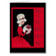 Tarjeta de Navidades rojos y negros vintage. Mujer con abrigo rojo con gorra y muff de piel blanca. Gorra y barniz están decorados con flores y cintas de Navidad rojo. A la derecha "Ten una muy Feliz Navidad"