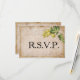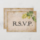 Este antiguo RSVP de bodas presenta un patrón de papel marrón chic y vintage con un aspecto angustiado. A la vuelta de la esquina hay un elegante borde dorado con un bonito de bayas amarillas en la esquina.