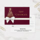 Lujoso y rico diseño vacacional con una espléndida silueta de árbol de Navidad con copos de nieve dorados. Decorada con un arco dorado blanco sobre un fondo violeta de frambuesa de color rojo oscuro y oscuro. Este certificado de regalo es perfecto para su pequeña empresa o para regalar a amigos y familiares.